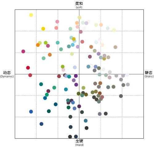 精心篩選出能夠表達(dá)人們對(duì)顏色的感覺(jué)的多個(gè)形容詞,然后利用SD方法對(duì)不同工作、生活環(huán)境中的1000個(gè)人進(jìn)行了相關(guān) 的測(cè)試,用于測(cè)試的顏色是色相&色調(diào)(Tue & Tone)表中的116種不同的顏色。“單色印象空間”就是對(duì)這次測(cè)試的數(shù)據(jù)進(jìn)行科學(xué)整理后得到的結(jié)果。從結(jié)果可以獲知,人們對(duì)顏色進(jìn)行評(píng)價(jià)時(shí),最習(xí)慣使 用的4個(gè)形容詞是“柔和(Soft)”、“生硬(Hard)”、“動(dòng)態(tài)(Dynamic)”、“靜態(tài)(Static)。